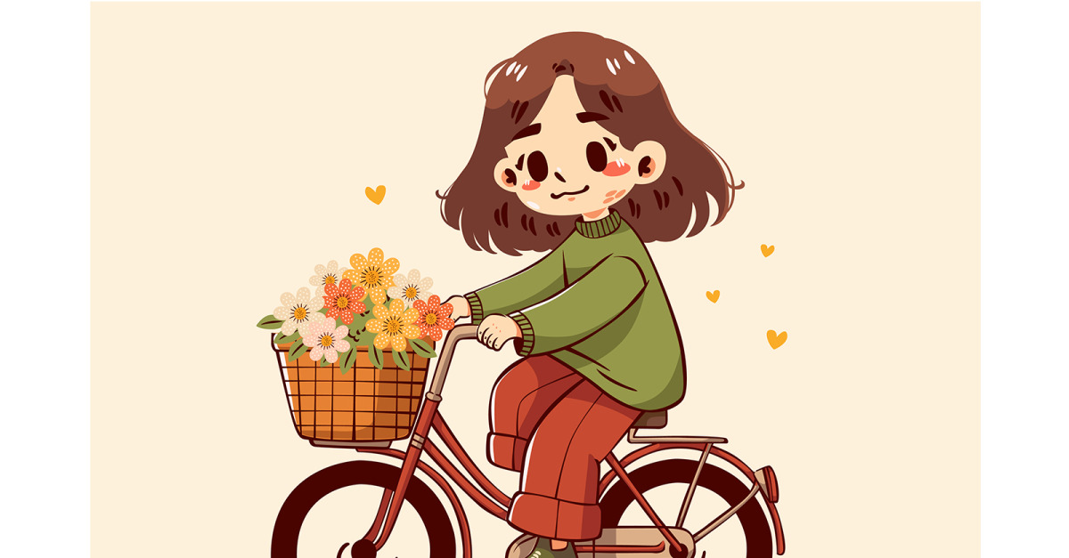 File Included : AI (CS6)EPS10Image 4000 x 3000 (px) **Explore a vibrant celebration scene featuring a cheerful cartoon girl on a bicycle, illustrated for the perfect spring day mood** **The illustration features a cartoon girl riding a bicycle on a spring day. She has a basket filled with flowers at the front of her bike**