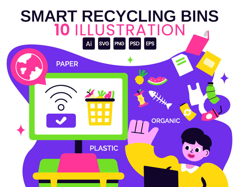 Smart Recycling Bins Illustration Featuring Technology with Intelligent Waste Sorting, Environmental Monitoring, and Sustainable Garbage Management Suitable for Poster, Web Banner, Brochure, Landing Page and Others Background Template Features: – Fully editable vector files, easy to edit the object, color and background – Include 100% vector Ai, Eps 10, SVG – PNG transparent background –…