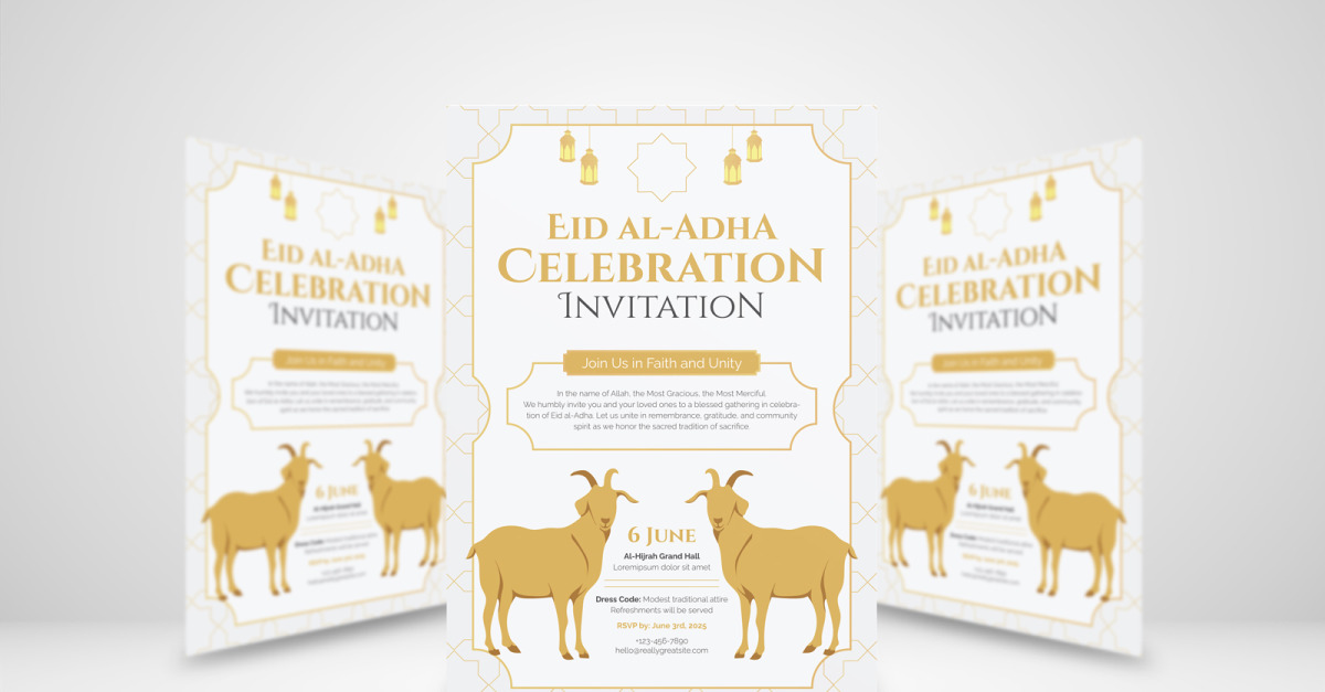 Eid al-Adha Celebration Invitation This professionally designed Eid al-Adha invitation template features an elegant and festive layout with golden elements, traditional Islamic motifs, and illustrated sacrificial goats. Perfect for community gatherings, family celebrations, or formal events, this template communicates warmth, unity, and spiritual reflection. Editable in various formats, it’s ideal for print or digital sharing…