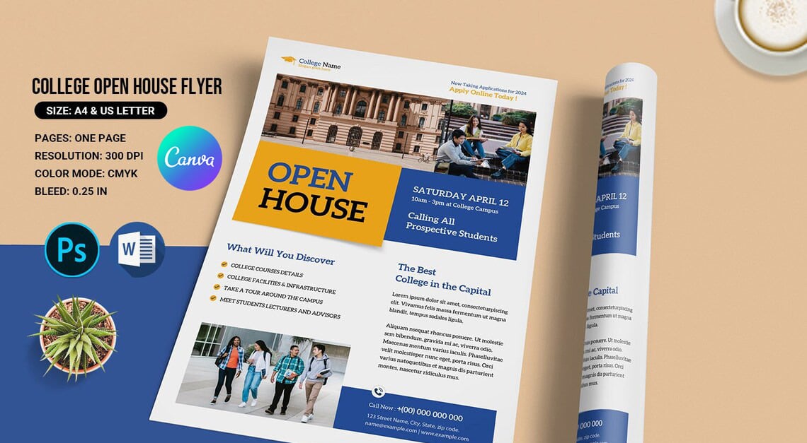 College Open house admission Flyer Template. All object is in separate layer, grouped and named. Easy to edit, smart object used, easy to replace photo here. This is not mockup Photo not included, download link attached in help file. Information: Size: A4 & Us LetterPages: One PageResolution: 300 dpiColor mode: CMYKBleed: 0.25 inWorking file: Photoshop…