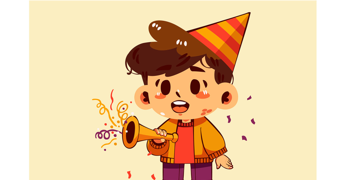 Boy Wearing Colorful Party Hat and Holding Trumpet
