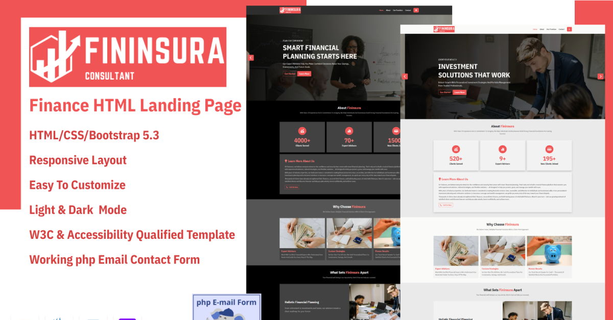 Build trust with your clients and showcase your financial services professionally with this modern finance company HTML landing page template. Designed for investment firms, financial advisors, insurance brokers, and corporate consultants, this template combines clean design with functional features to convert visitors into clients. Crafted with HTML5, CSS3, and Splide JS for smooth sliders and…