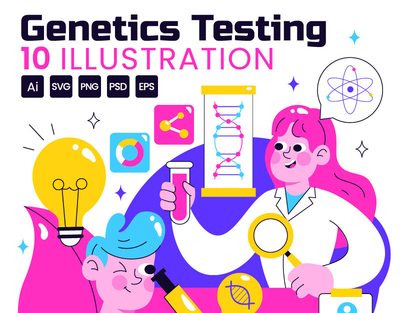 Genetics Testing Illustration Featuring DNA Molecule Structure, Scientific Research, and Laboratory Experiment with Scientists in a Technological Background Suitable for Poster, Web Banner, Brochure, Landing Page and Others Background Template Features: – Fully editable vector files, easy to edit the object, color and background – Include 100% vector Ai, Eps 10, SVG – PNG transparent…