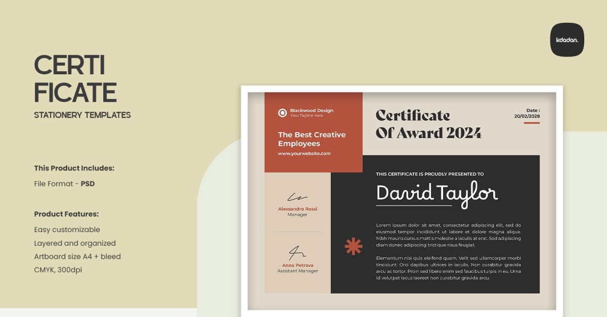 Overview : Clean, Modern and Professional Certificate. Fully customizable, easy to use and replace colors & text, logo containers are Smart-Objects to make it easy for you to add logo and edit files. This Product Includes: – Compatible files for Adobe Photoshop CS/CC – Help Files Product Features: – Fully customizable and editable PSD template…