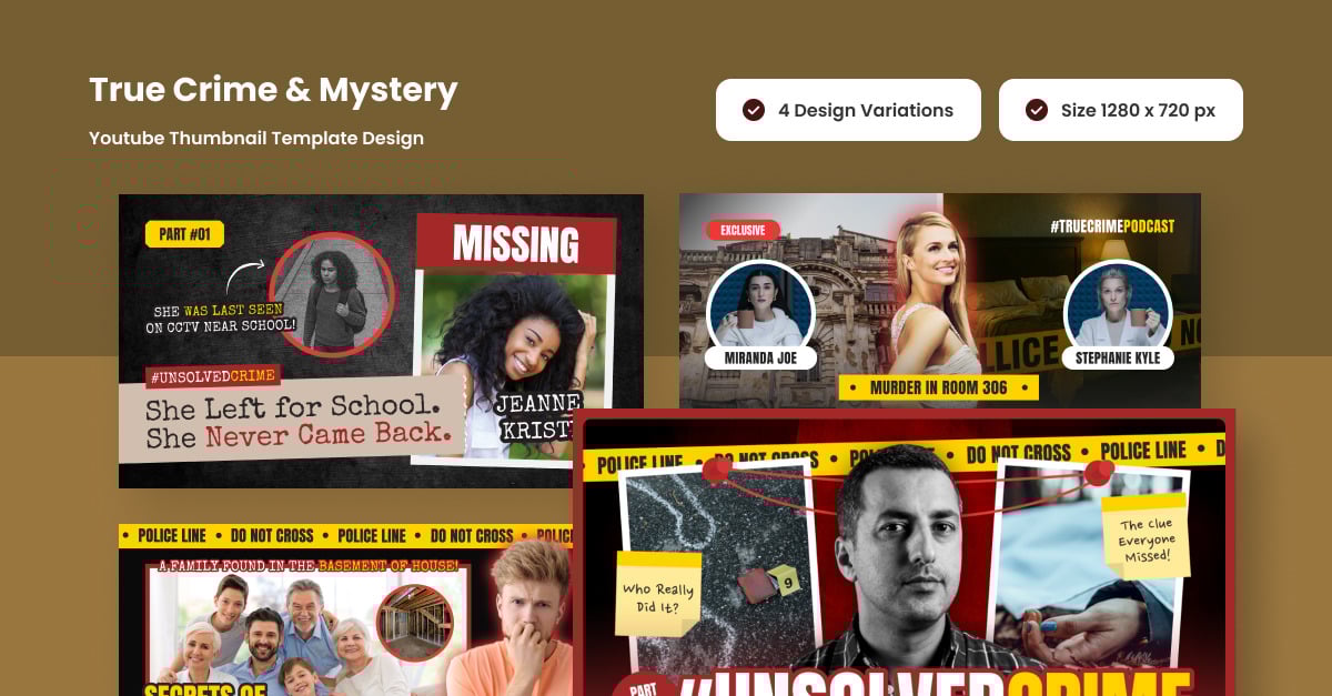 Designed to perfectly align with the true crime and investigative documentary genre. Featuring expressive close-ups, high-contrast blood-red accents, and typography styled like confidential files, this layout instantly sparks curiosity. Make your content stand out in a crowded feed. **Highlights:** – Thumbnail Size (1280×720 px) – 4 Design Variations – Fully Layered and Editable – Fully…